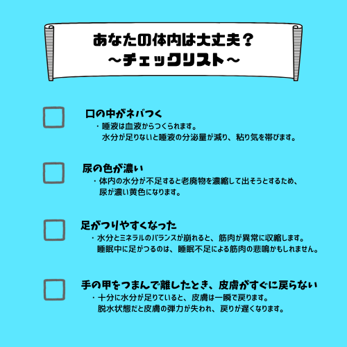 「喉が渇かないから大丈夫!」と思っていても、身体の中はカラカラに渇いているかもしれません。